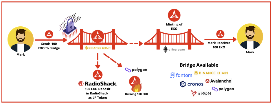 A ExoBridge is an application that uses cross-chain communication technology to enable transactions between two or more networks, which can be Layer 1s, Layer 2s, or even off-chain services and It's a separate contract that uses a **multichain-proof-of-stake** (MuPoS) consensus mechanism. Simply put, a bridge allowing crypto holders to transfer their assets from one network to another. For example, a EXO holder on Polygon might want to transfer their EXO from Polygon to Ethereum via a ExoBridge.